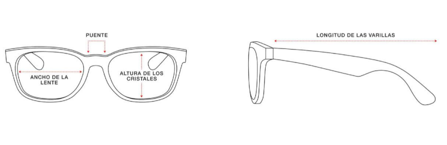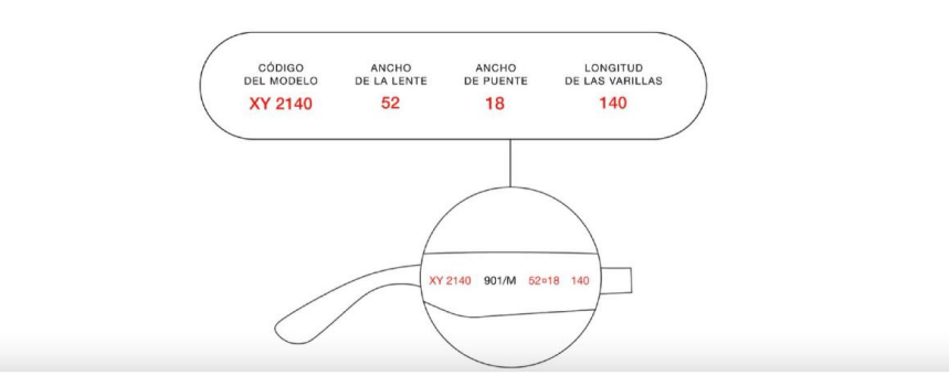 El primero es el nombre del modelo, y luego viene el ancho de la lente y el ancho de puente. Suele haber un tercer número que representa la longitud de la varilla, que es la medida en milímetros de los «brazos» de la montura. A veces también hay un cuarto número que es la altura de la lente.